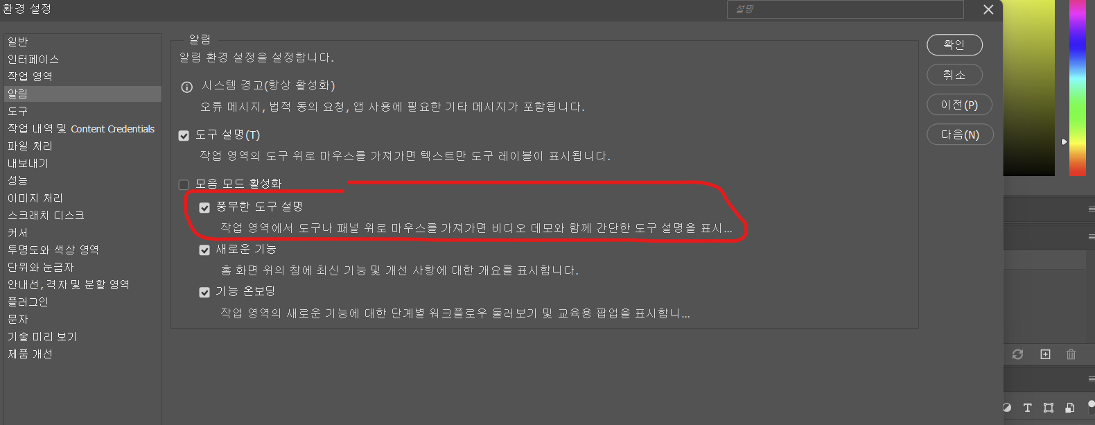 사진에 있는 것처럼, 도구에 마우스 올렸을 때 썸네일 보이는 건 풍부한 도구 설명을 체크 해주면 되겠다.
