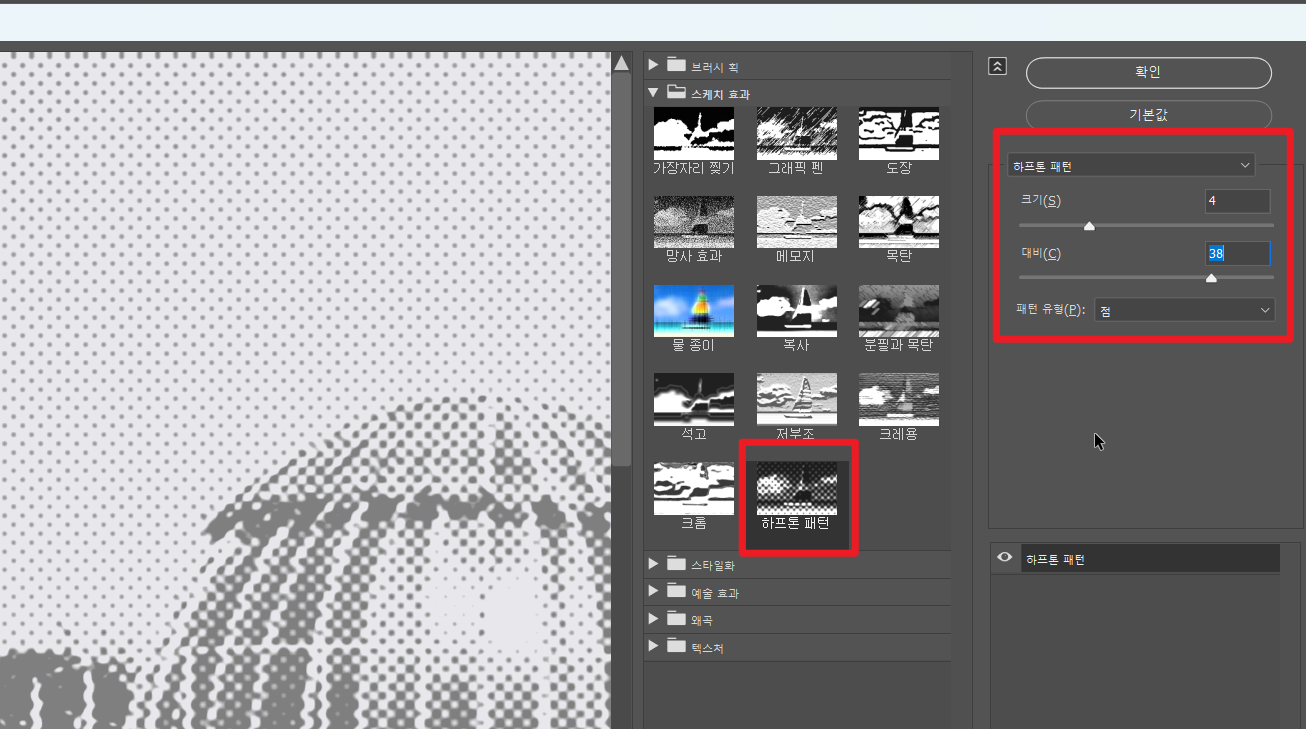 하프톤 패턴으로들어가서 크기와 대비 (명도조절) 을 해주면 되는데,